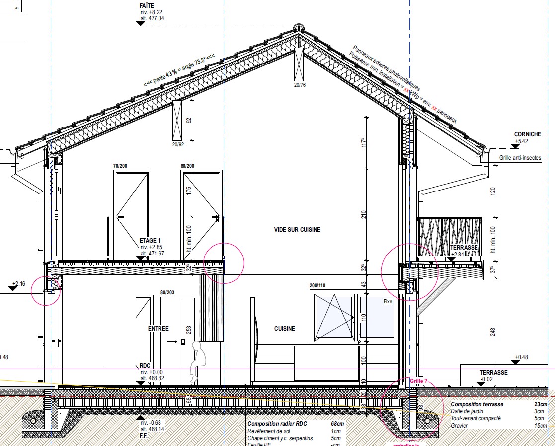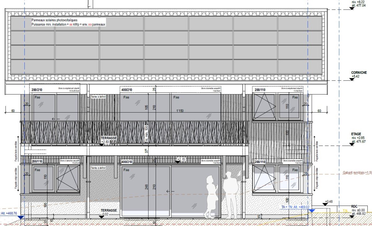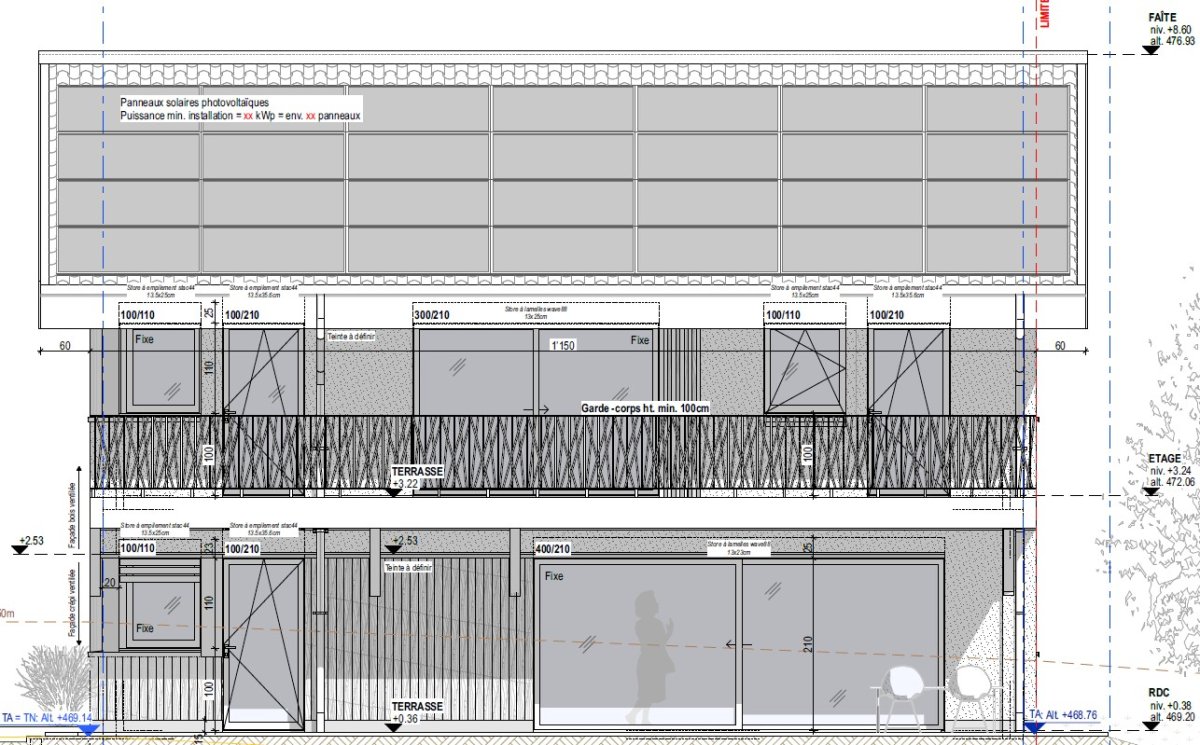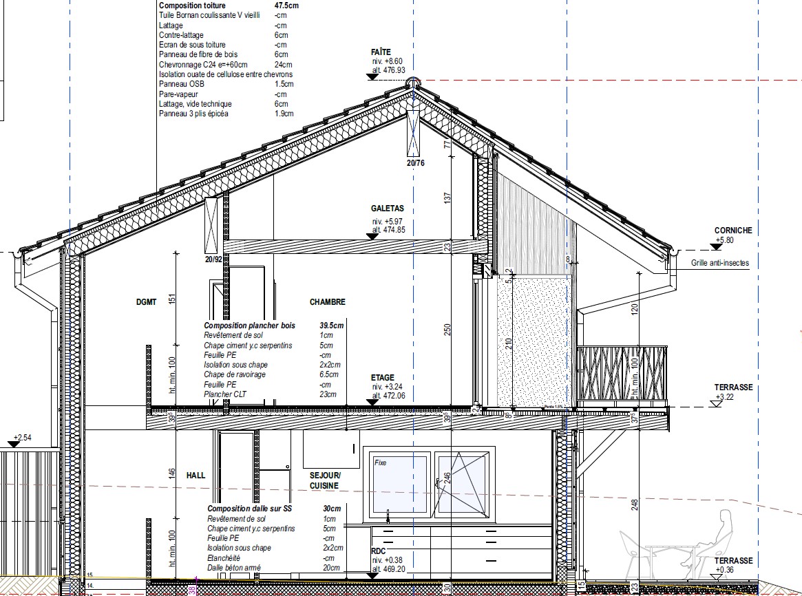 Type construction : Construction à ossature bois et CLT, balcons CLT en porte-à-faux sur consoles acier